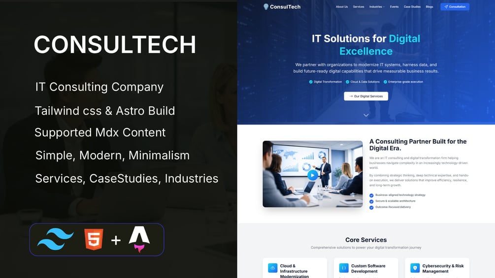 Consultech is a modern IT Consulting Company Website Template built with Astro for blazing-fast performance, clean architecture, and SEO-friendly delivery. Designed specifically for IT consulting firms, digital transformation consultants, software houses, cloud & infrastructure providers, cybersecurity companies, and enterprise technology services, Consultech delivers a professional, credible, and high-conversion digital presence tailored for B2B audiences.